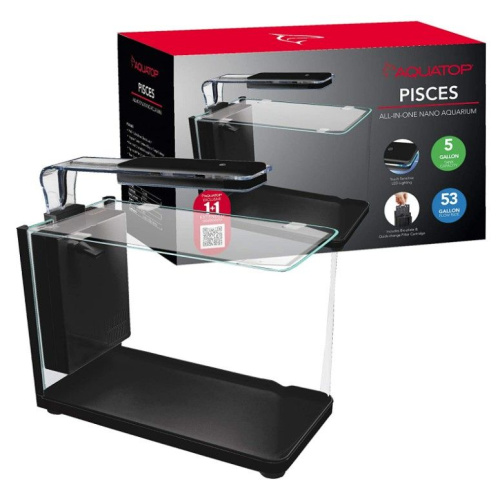 Aquatop Pisces Modern Bullet Shapped Glass Aquarium - 5 gallonPISCES Modern Bullet-shaped Glass Aquarium, 5 Gallons Aquatops Pisces All-in-One Series of Nano Glass Aquariums offer a variety of sleek, modern designs. The PCS-5GB has a bullet-shaped glass design with seamless curved corners. Each unit includes an innovative and unique multi-stage internal filter box system which comes complete with a submersible pump and an easy-change drop-in filter cartridge filled with premium activated carbon. In addition to the Mechanical and Chemical filtration, the Pisces Nano Aquariums also includes a drop-in Bio-plate and ceramic rings for superb Biological Filtration. All models include a super bright touch-sensitive LED Light complete with a moonlight setting, and a tank lid with mounting clips. These space-saving desktop aquariums are perfect for fresh or saltwater set-ups.