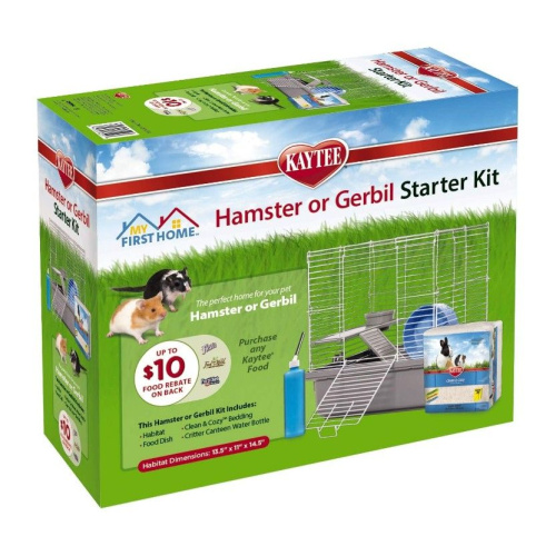 Kaytee My First Home Hamster or Gerbil Starter Kit contains everything you'll need to provide a safe, loving home for your pet including a habitat, Clean & Cozy bedding, water bottle, and food dish. The habitat features a deep plastic base that prevents bedding from scattering and easily separates from the wire top for convenient cleaning. Comfort shelf, safety ramp, and exercise wheel are included to encourage healthy activity and exercise. The sturdy wire frame has 1/2 inch bar spacing and chew-proof latches and locks to keep pets safe and secure. Habitat is easily assembled with no tools required. Ideal for use with a pet hamster or gerbil.