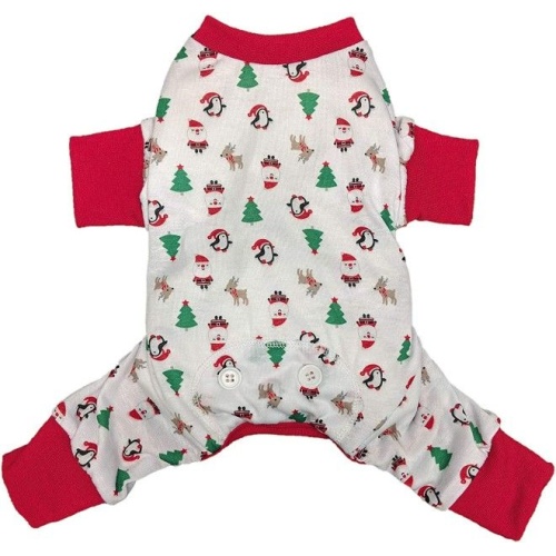 Get your furry friend in the holiday season with these Jingle Jam Dog Pajamas by Fashion Pet featuring cute santas, trees and penguins. Cozy interlock cotton blend PJs featuring faux back flap with button detail and matching rib trim.